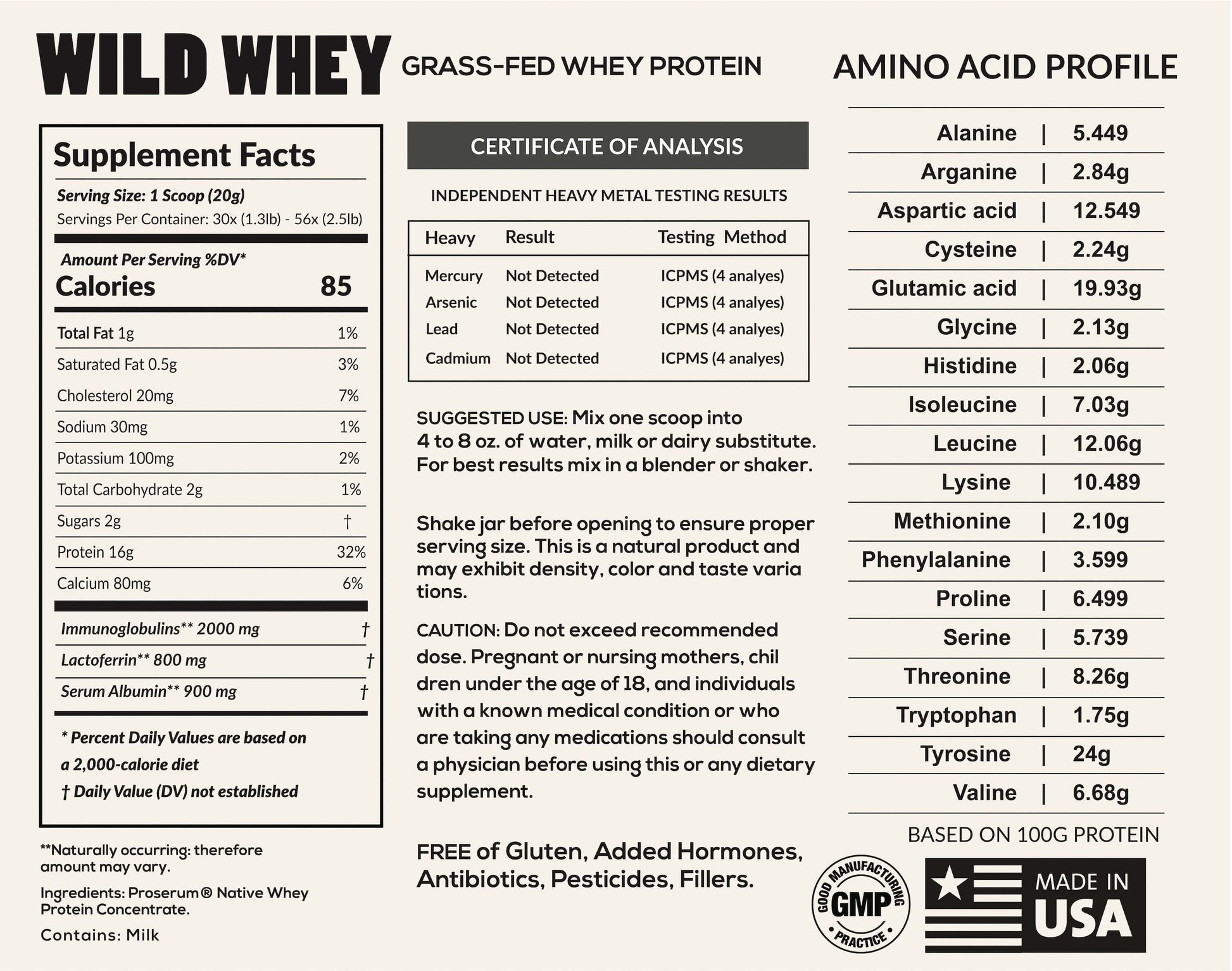 Support your healthspan with Wild Whey Grass-Fed Protein, a minimally processed, non-denatured whey made from the raw milk of 100% grass-fed cows. Unlike mass-produced whey, Wild Whey is free from fillers, irradiation, and harsh treatments, retaining its biologically active components to promote muscle growth, recovery, and immune health. Sourced from cows grazing year-round on organic pastures, this pure whey provides a creamy texture and rich nutritional profile, ideal for smoothies, shakes, or coffee.