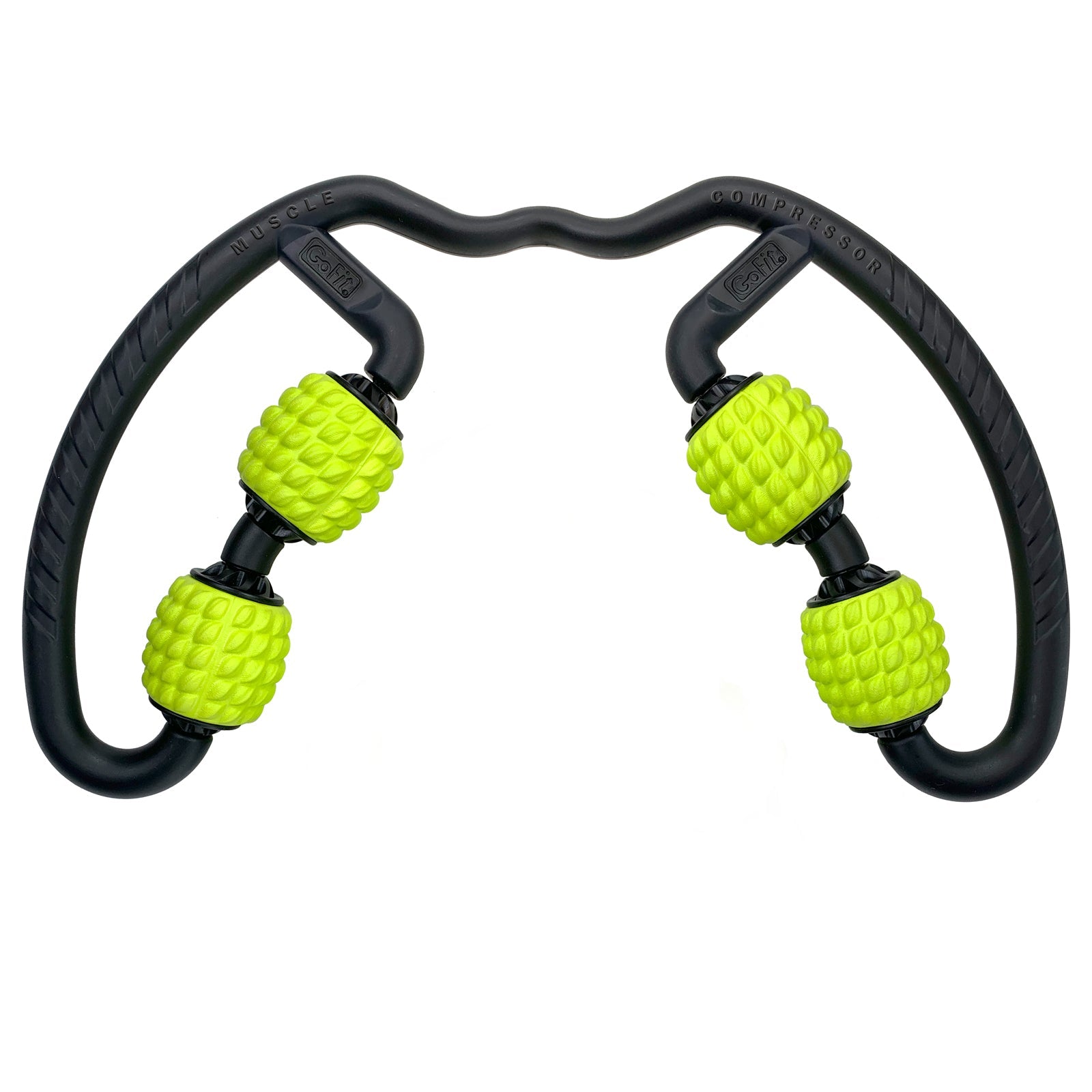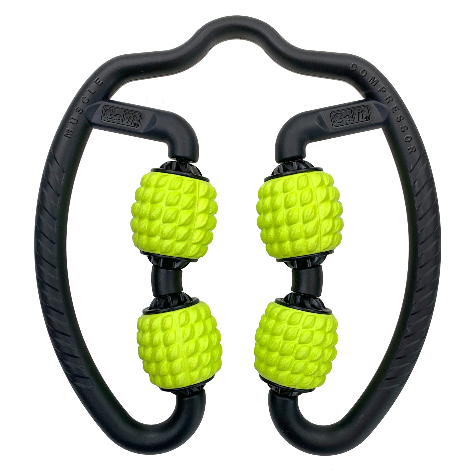 Target sore muscles with four massage rollers in one. With leverage handles, apply just the right compression for your ideal muscle relief. The bottom rollers will spread from 0" to 11" wide, so the GoFit Muscle Compressor is perfect for quads, calves, arms, and more.