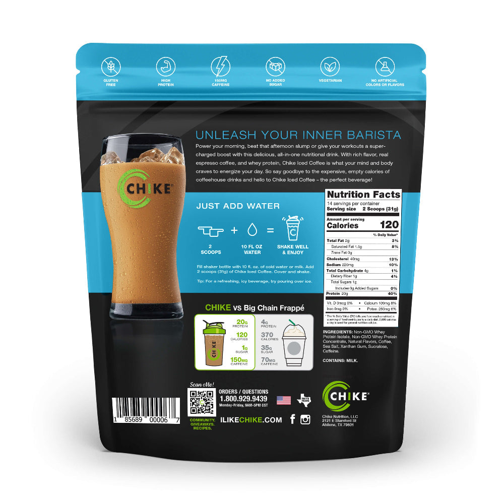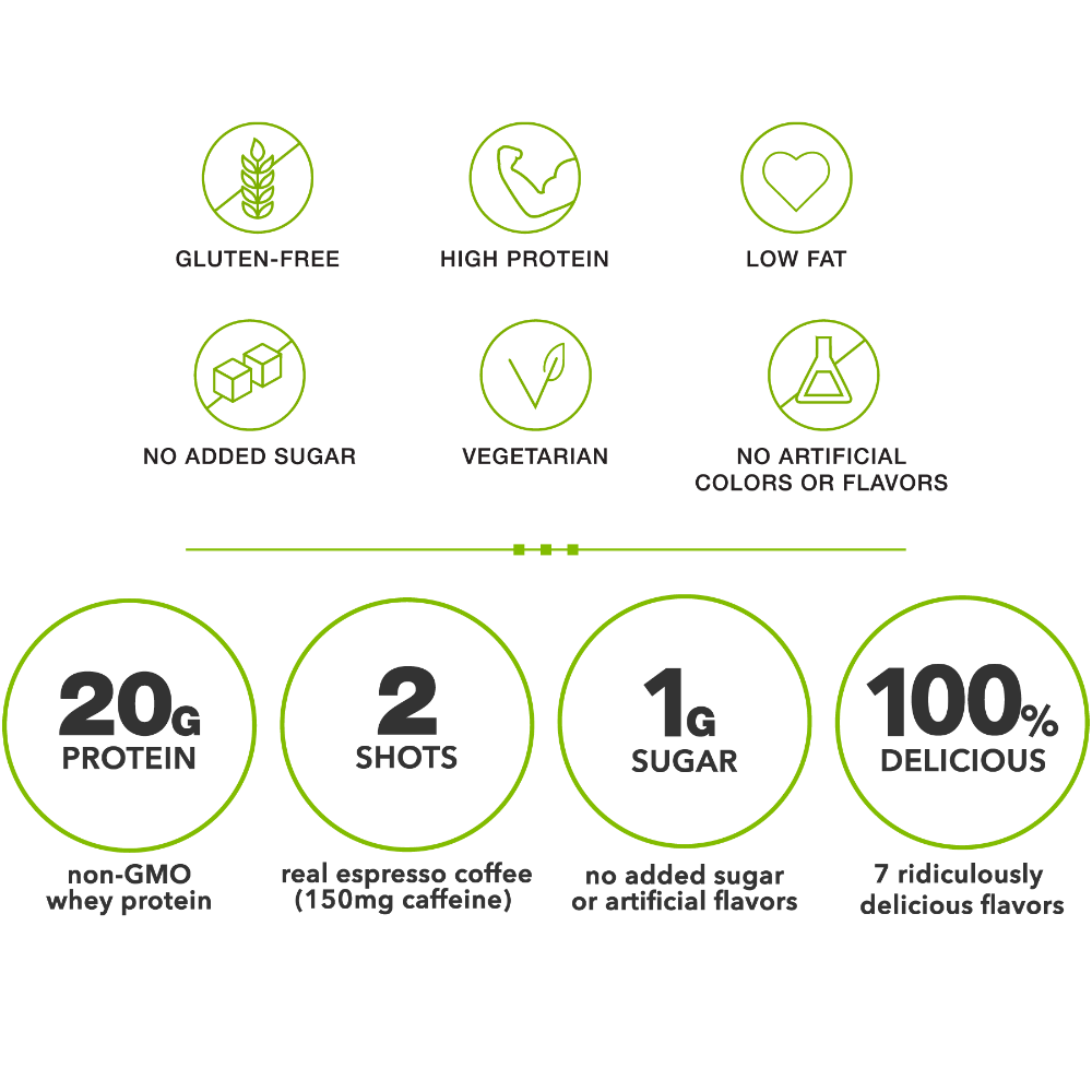Each serving has 20g protein, 2 shots of espresso, and only 1g of sugar. Available in 14 serving bags and 10-count single-serving packets. Click here to shop our sampler packs.